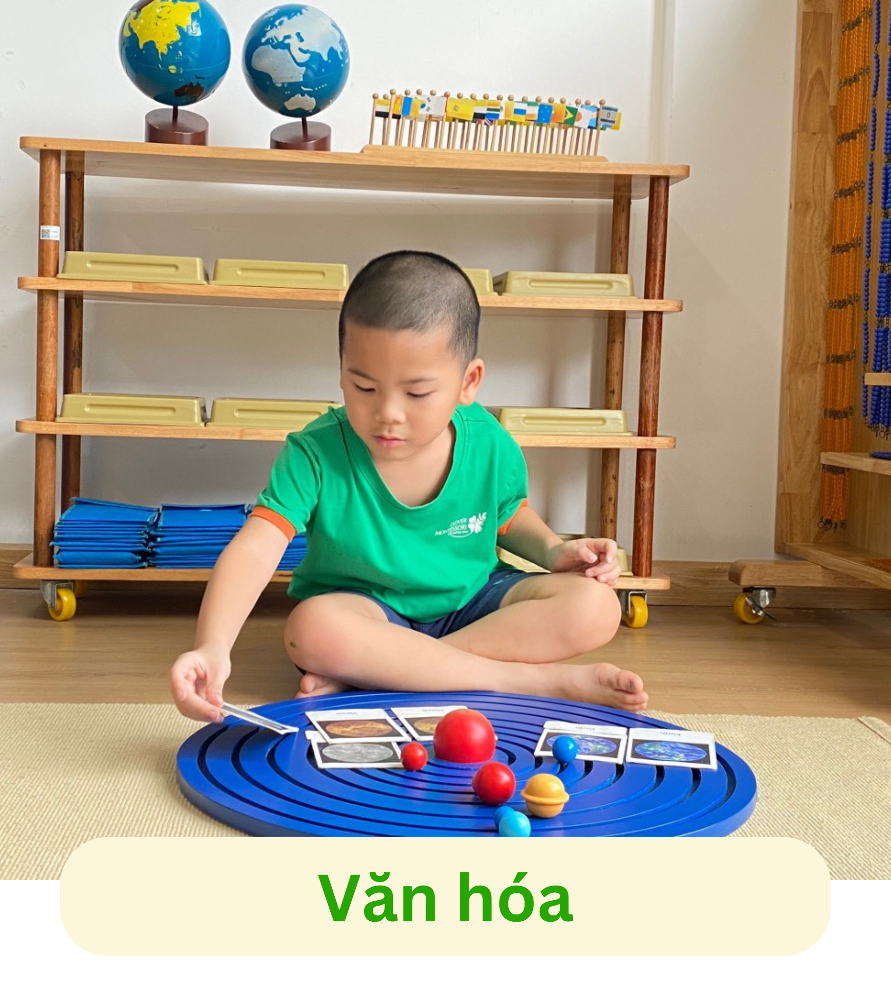 – Trong các lớp học Montessori giúp trẻ hiểu biết về khoa học đời sống, khoa học lịch sử, vật lý, địa lý, nghệ thuật: nhảy và âm nhạc, tất cả được giới thiệu cho trẻ dưới hình thức như một bài học văn hóa.